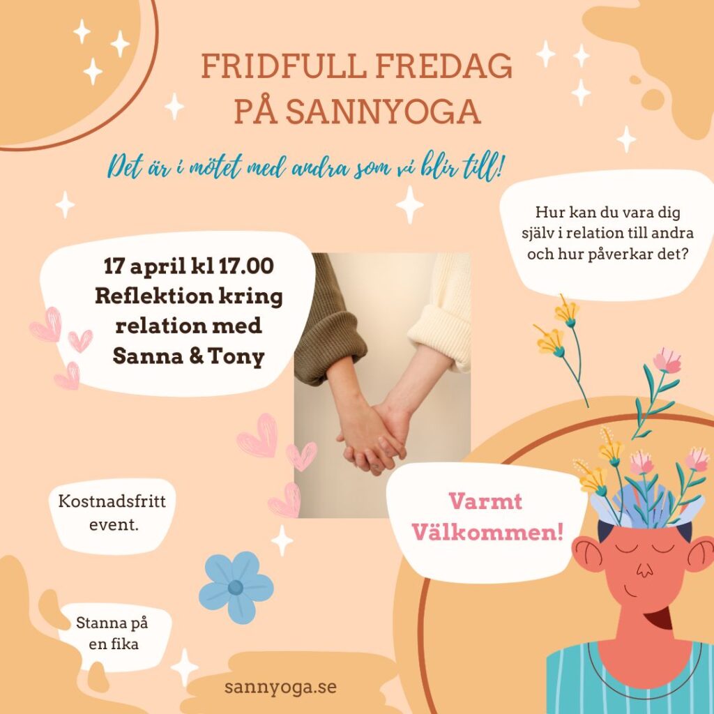 Vi på SannYoga vill bjuda in till ett skönt avslut på veckan. Ett avslappnat sätt att mötas och få möjligheten att stanna upp en stund och kanske prova något nytt. Efter eventet får du gärna stanna på en fika, prata om det som du upplevt eller bara vara.